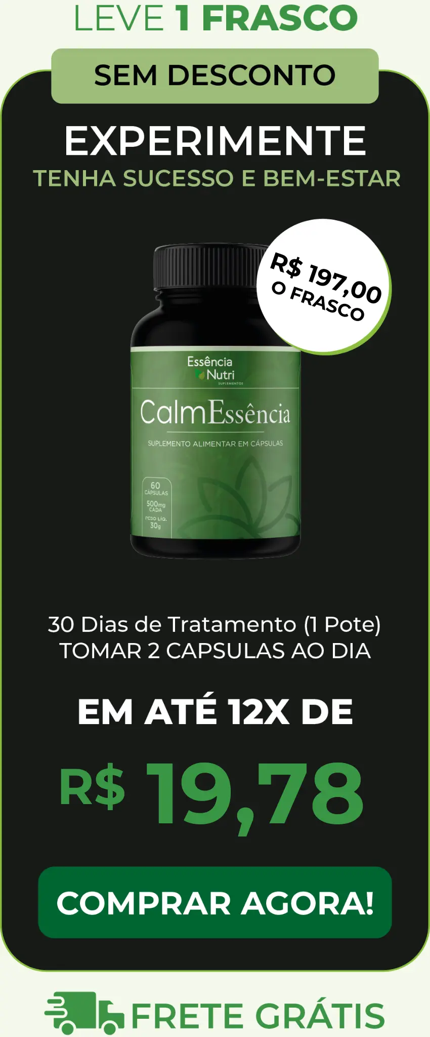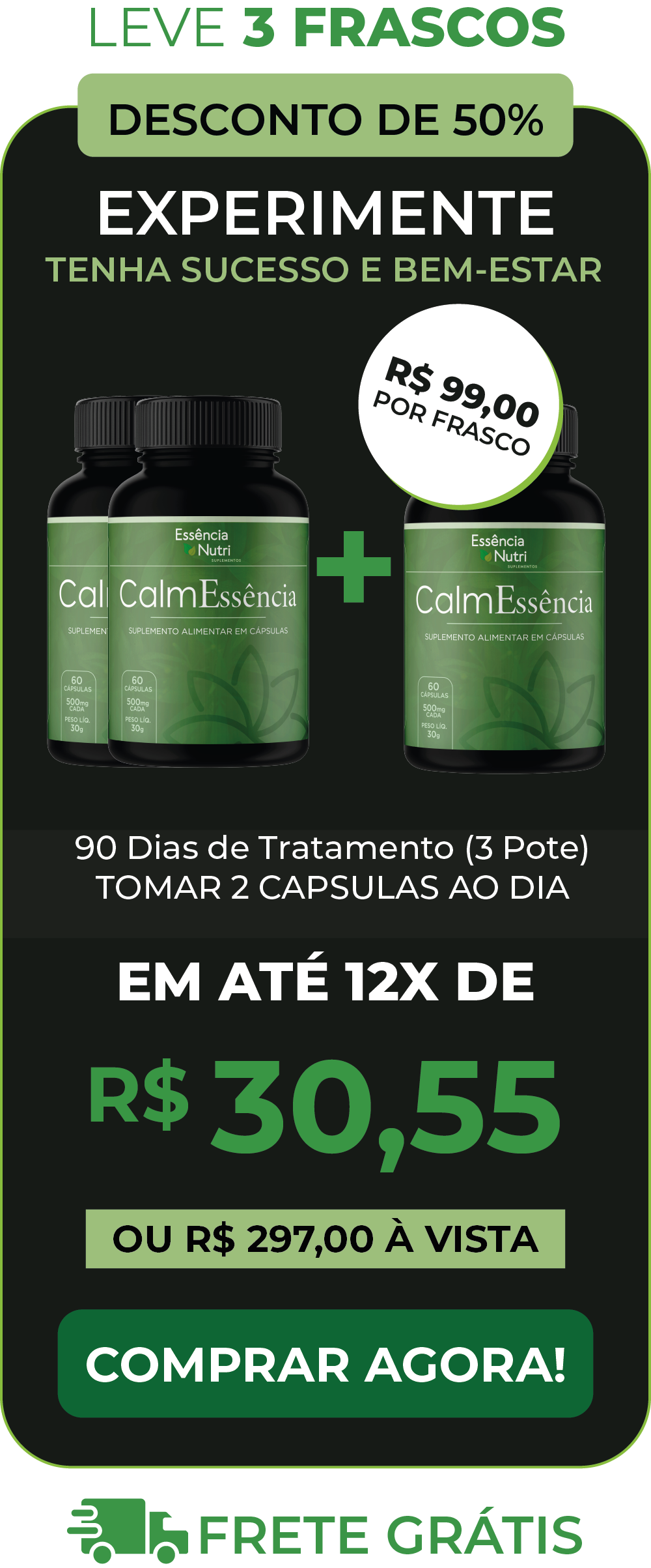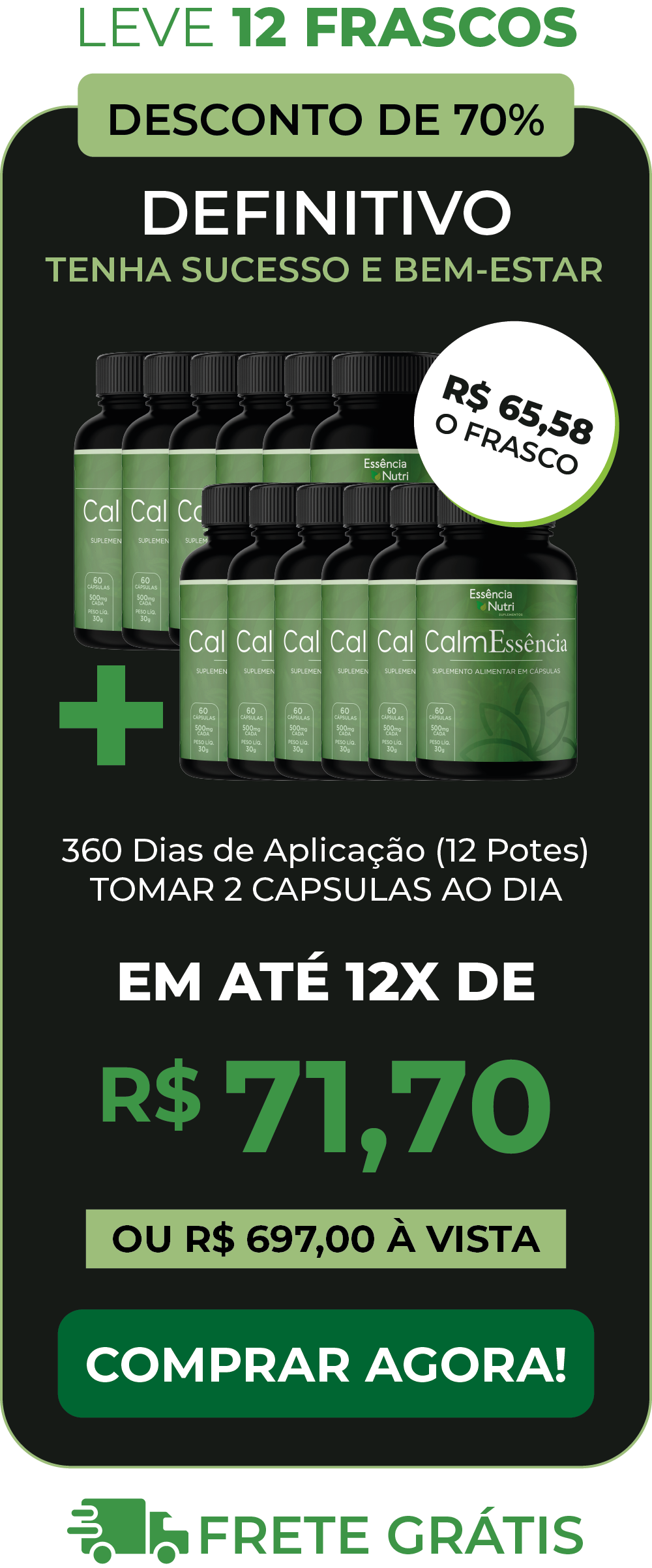 O Calm Essência reduz os níveis de estresse ao promover relaxamento e controle emocional. Você a enfrentar o dia a dia com mais calma e clareza mental.